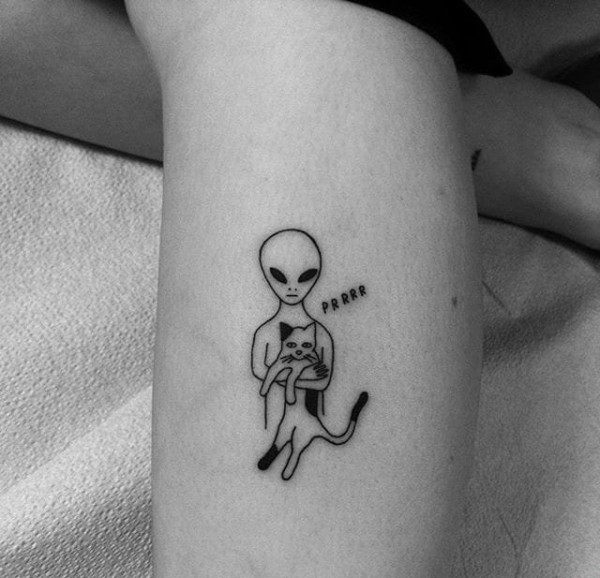 手臂上黑色的线条纹身猫和外星人纹身图案