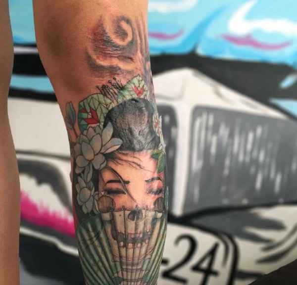 包小腿彩色经典传统艺妓莲花扇子纹身图案