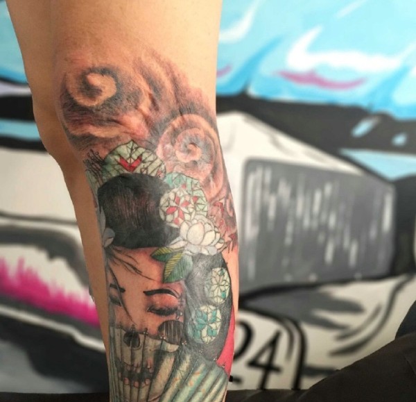包小腿彩色经典传统艺妓莲花扇子纹身图案