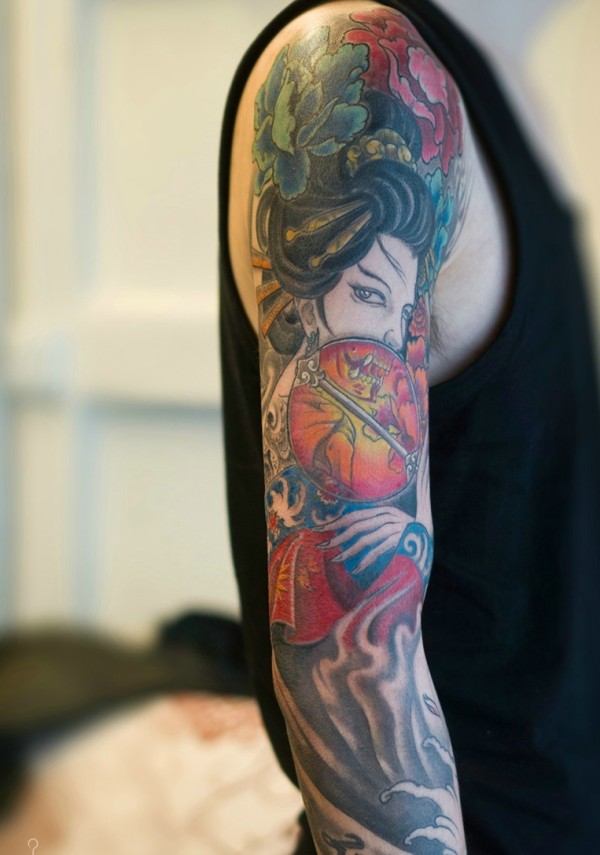 古典精致的彩色花臂牡丹花艺妓海浪纹身图案