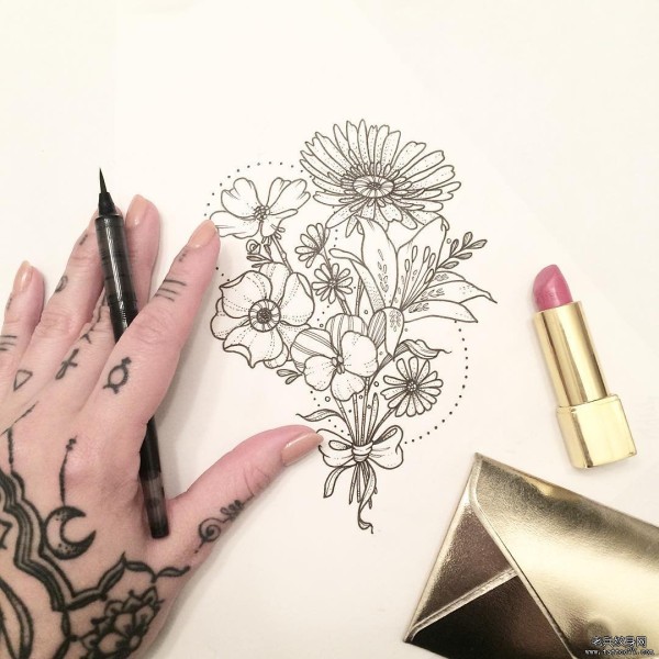 欧美小清新花朵线条点刺纹身图案手稿