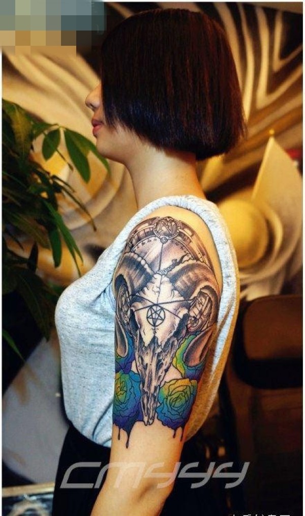 手臂时尚很帅的羊头骷髅纹身图案