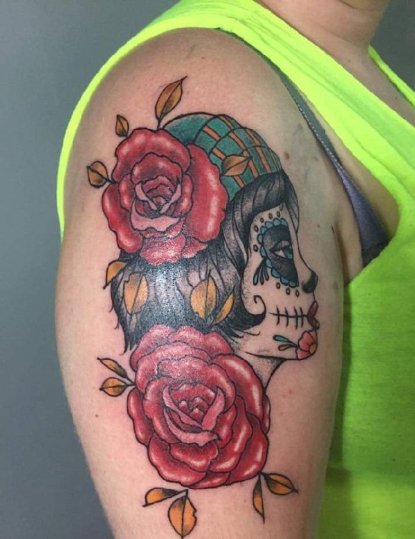女性右手大臂膀上漂亮的花朵和僵尸女人纹身图片