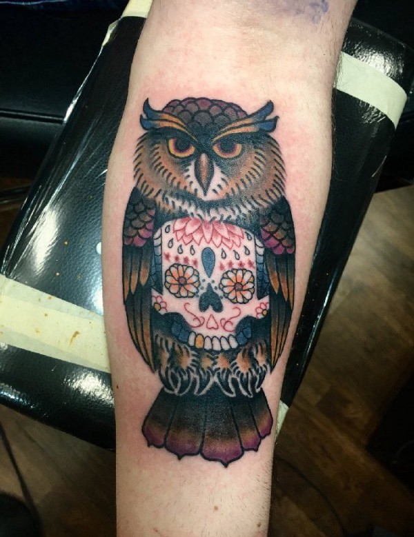 小腿上帅气的彩色猫头鹰纹身动物纹身图片