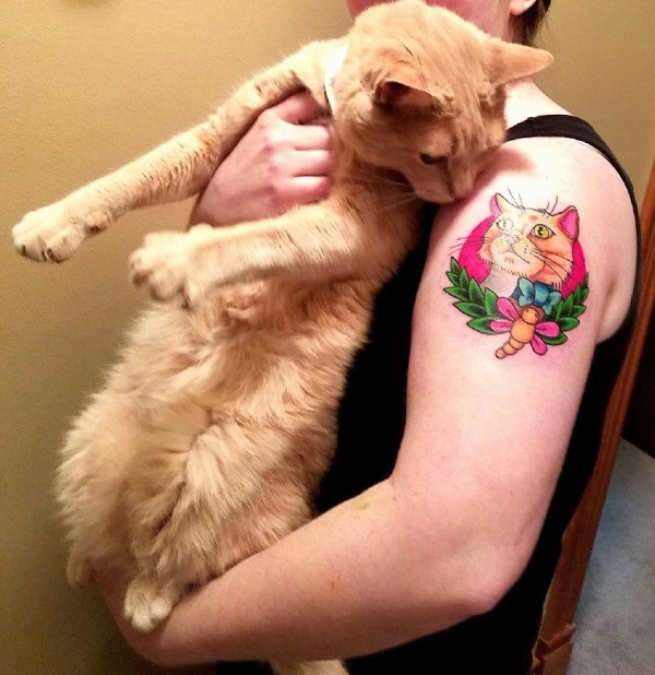 女子左手大臂上漂亮的彩色宠物猫纹身图片