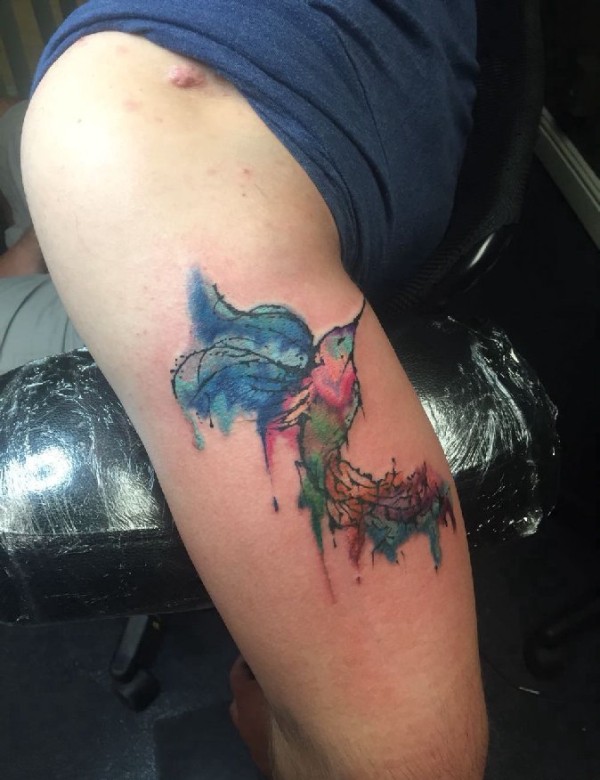 左手大臂膀上漂亮的水彩蜂鸟纹身图片