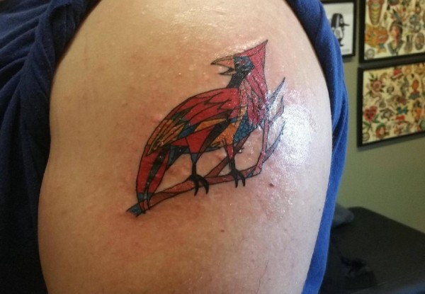 左手大臂上彩色鸟纹身图片