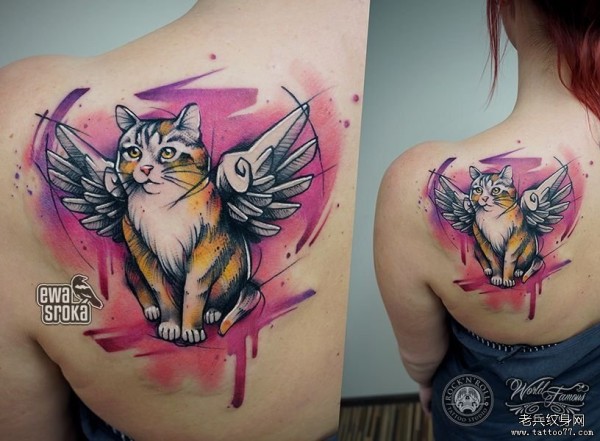 女生背部水彩泼墨猫翅膀纹身图案
