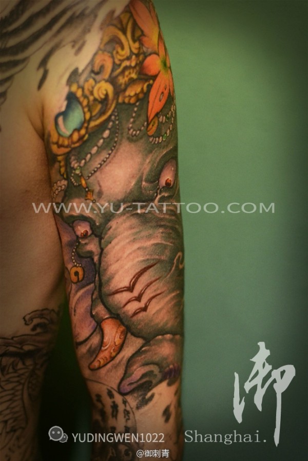 手臂黑灰象神_一组12张手臂上的黑灰象神纹身图案作品欣赏