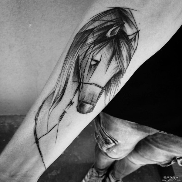 小臂马钢笔画风格黑灰纹身图案