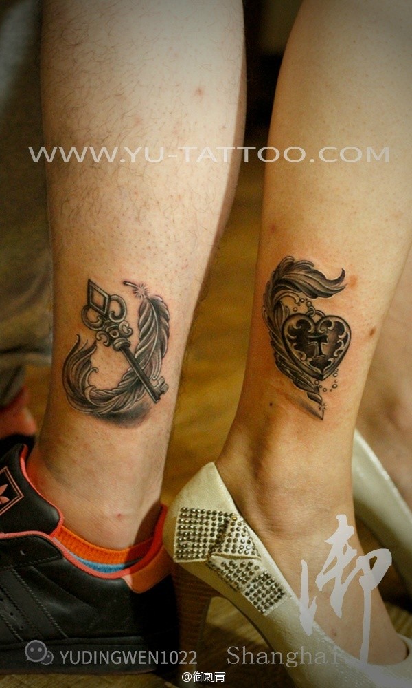 情侣脚踝钥匙和锁纹身设计