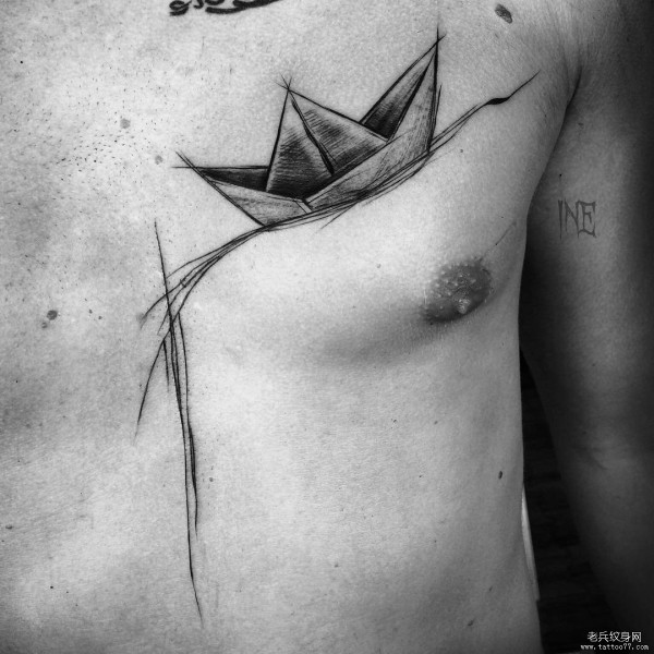 胸部纸船钢笔画风格纹身图案
