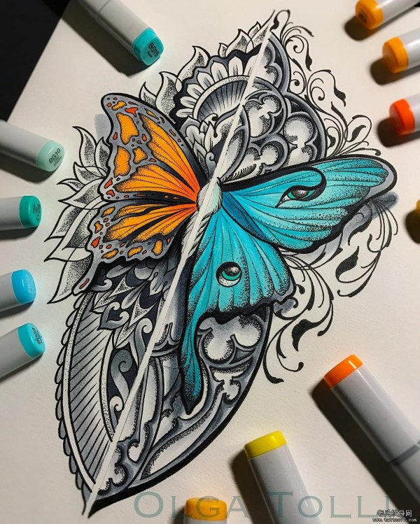 欧美school个性不对称蝴蝶梵花纹身图案手稿