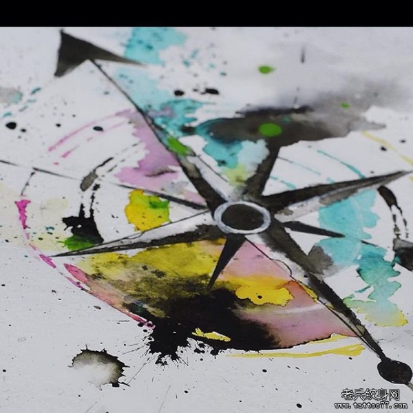 水彩泼墨风指南针纹身图案手稿