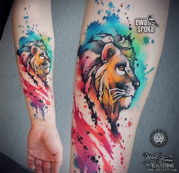 小臂欧美泼墨水彩狮子纹身图案