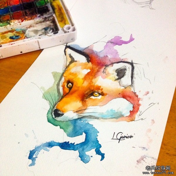 水彩泼墨狐狸头像纹身图案手稿