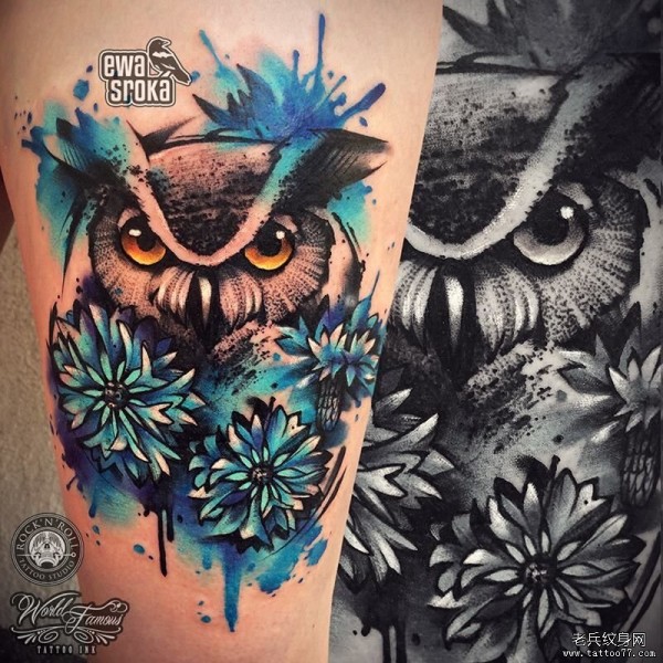 小臂猫头鹰花蕊泼墨水彩纹身图案