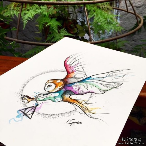水彩点刺泼墨猫头鹰纹身图案手稿