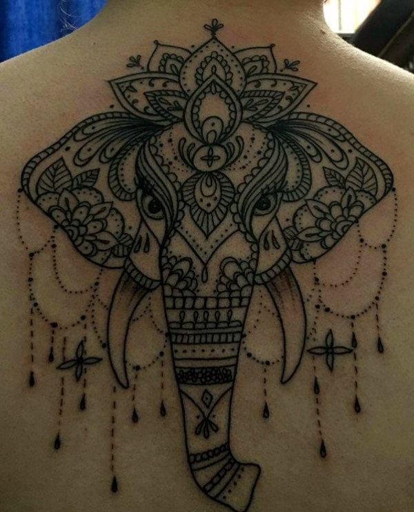 男子背上漂亮的大象曼陀罗图腾纹身图片