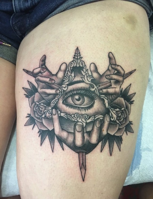 女性大腿上的黑灰色上帝之眼和多手纹身图片