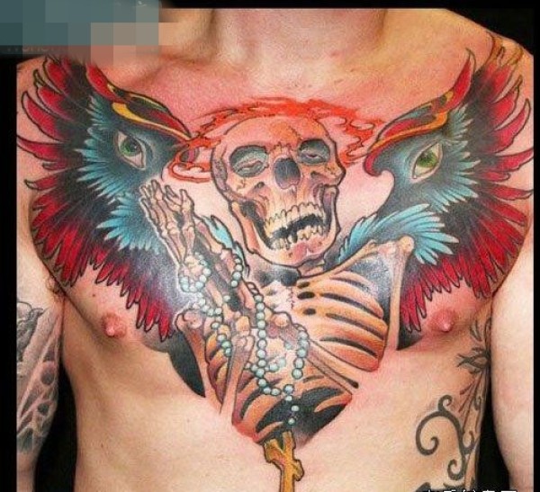 男人前胸超帅很酷的骷髅翅膀纹身图案