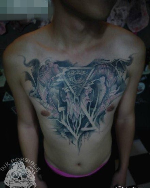 男人前胸超帅很酷的羊头骷髅纹身图案
