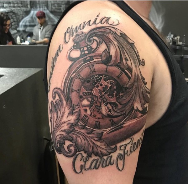男性右手臂上一块凤凰图案怀表的标志性纹身图案