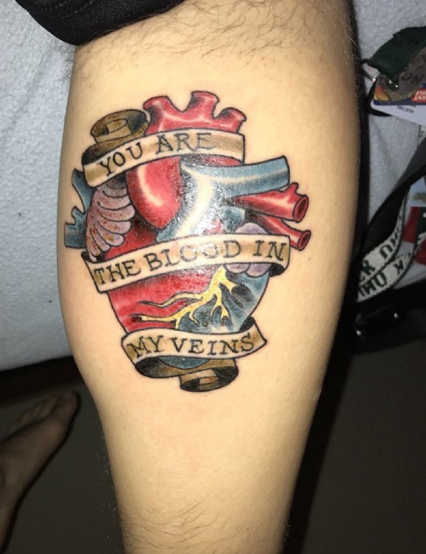 小腿上的横幅和解剖真实心脏纹身图片