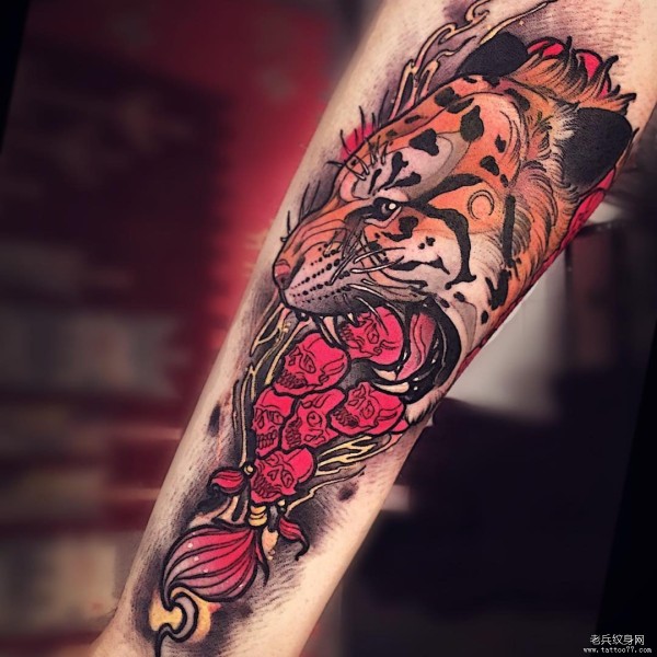 小臂个性欧美new school老虎骷髅纹身图案