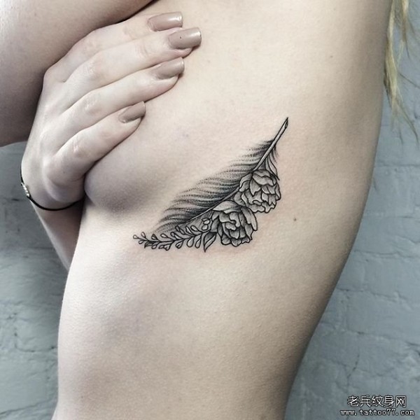 女生侧胸小清新羽毛玫瑰纹身图案