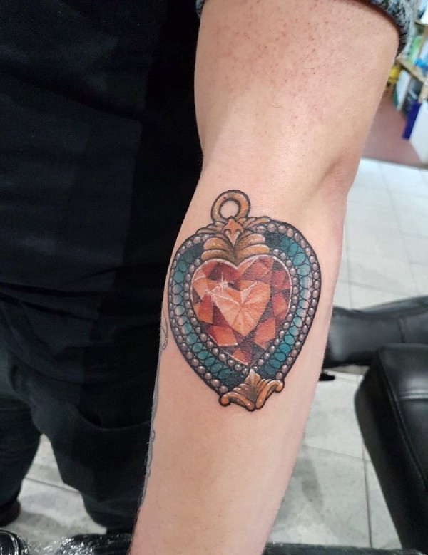 手臂上漂亮的红心形宝石挂饰纹身图片