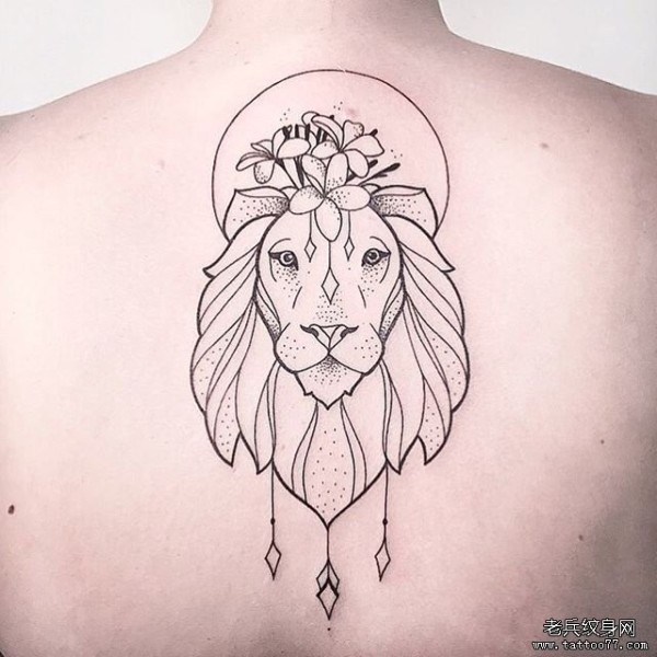 背部狮子花蕊线条点刺纹身图案