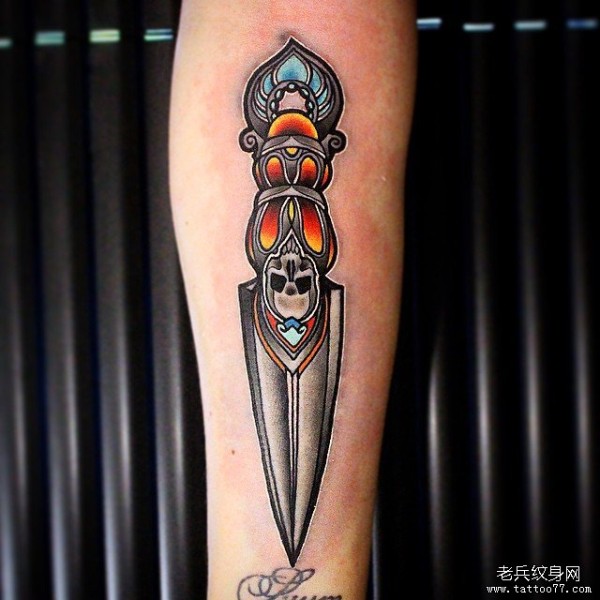 小臂彩绘school匕首骷髅纹身图案