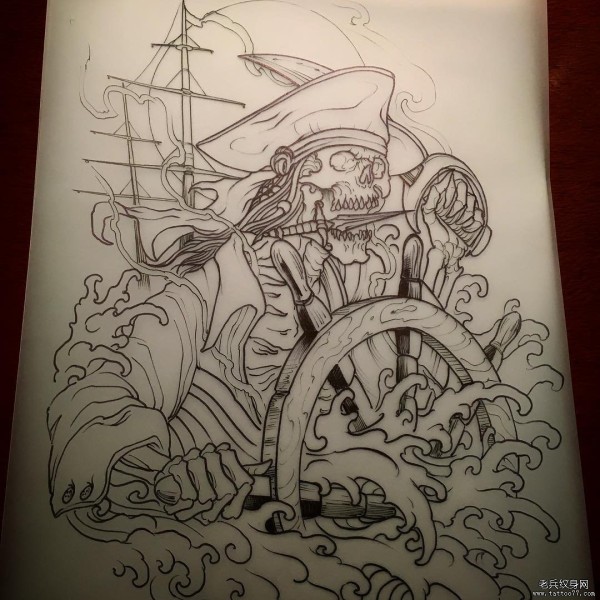 school欧美帆船骷髅船长匕首海浪纹身线条图案手稿