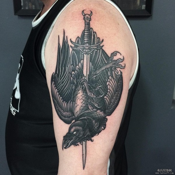 男士大臂乌鸦匕首遮盖纹身图案