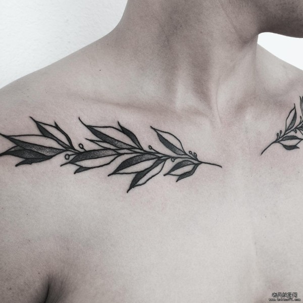 男性锁骨叶子线条点刺小清新纹身图案