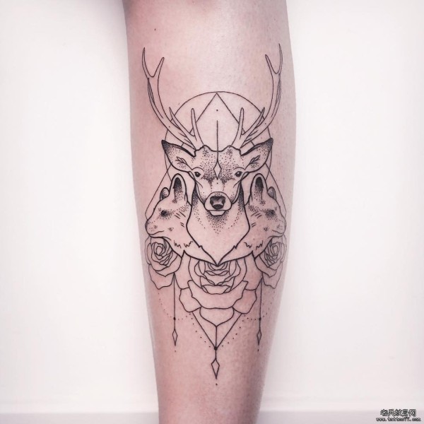 小腿麋鹿玫瑰几何点刺线条纹身图案