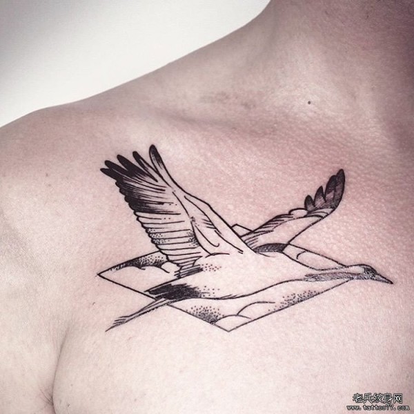 锁骨仙鹤几何点刺线条纹身图案