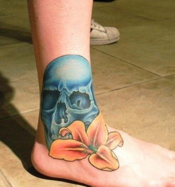 一款腿部骷髅百合纹身图案