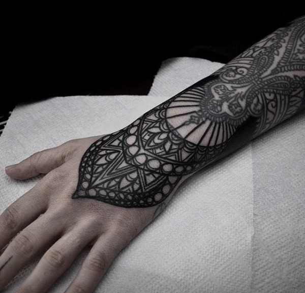 精致的黑色几何装饰风格手前臂纹身图案来自塔拉斯