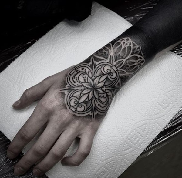精致的黑色几何装饰风格手前臂纹身图案来自塔拉斯