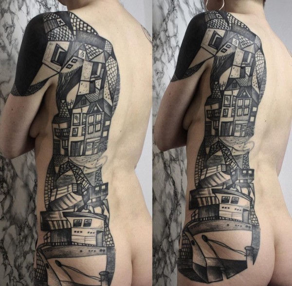 巨大的黑灰色满胸纹身图案大全来自纹身师格雷格