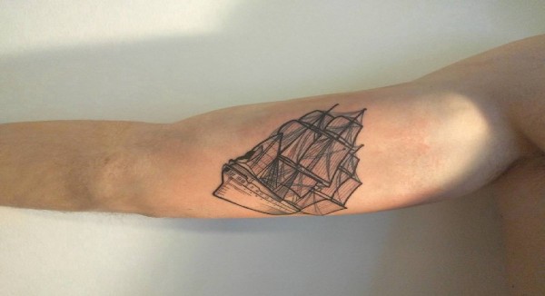 手大臂膀上漂亮的黑灰色帆船纹身图片