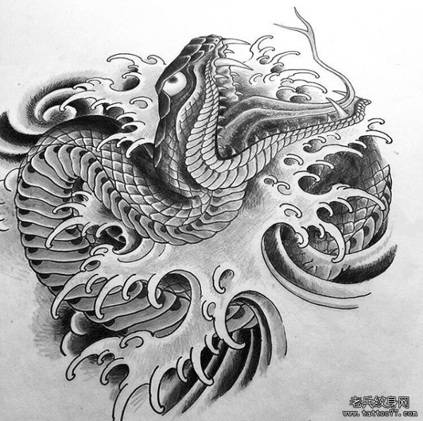 传统蛇浪花纹身图案手稿