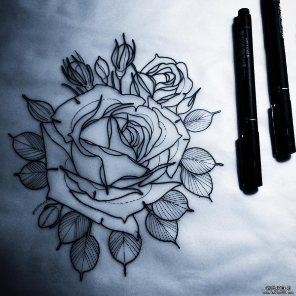 school玫瑰花线条纹身图案手稿