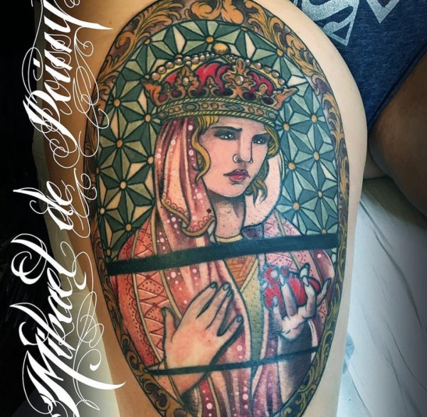 教堂风格的彩色玻璃诸神肖像纹身图案来自米卡埃尔