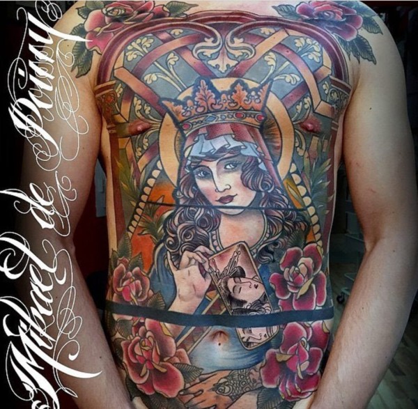 教堂风格的彩色玻璃诸神肖像纹身图案来自米卡埃尔
