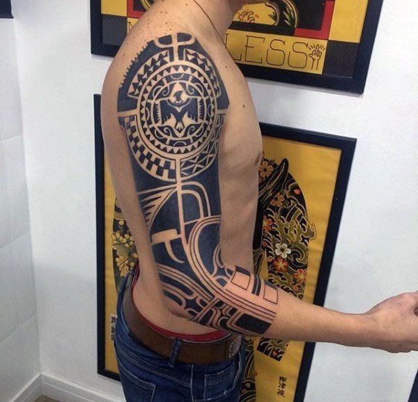 男性大臂膀上强健有力的黑色部落图腾纹身图案