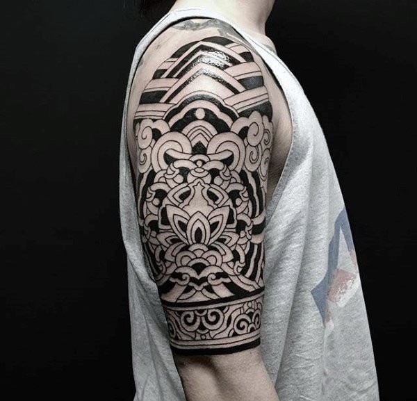 男性大臂膀上强健有力的黑色部落图腾纹身图案