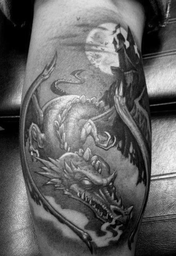 男性腿上霸气的龙纹身图案